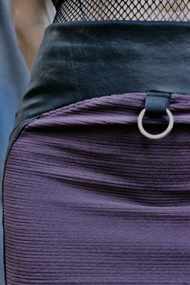 A RAYA skirt made from of dark purple fleece detailed with a black vegan leather pattern.