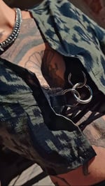 A SYRA blouse made from a light dark green leopard pattern detailed with rings and a carabiner closure.