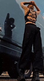 A SYRA Top made from a black synthetic stretch in combination with a black velour! The back is detailed with straps and rings.